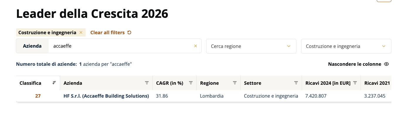Per il quarto anno consecutivo, HF è nella prestigiosa classifica “Leader della crescita”, a conferma della costante crescita di fatturato avvenuta negli ultimi anni.
